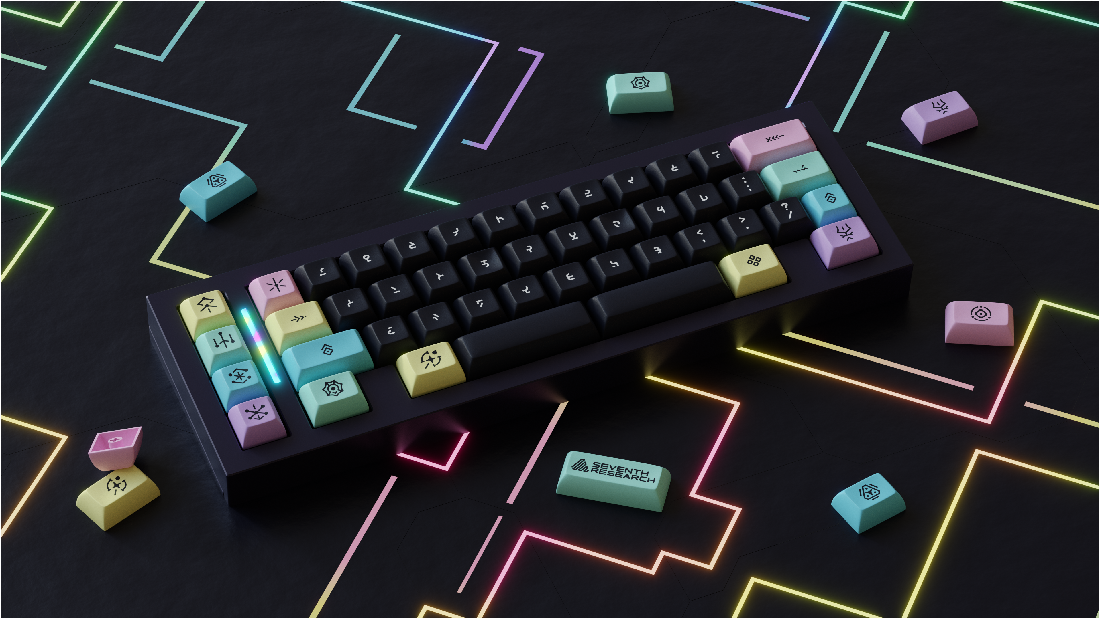 Designed by Dazon, this uniform profile keycap set features a modern pastel palette seamlessly integrated with cosmic sublegends.